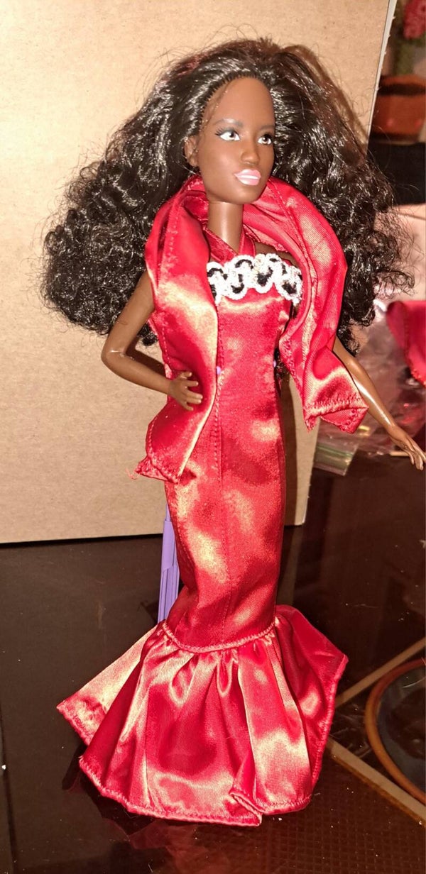 Beautiful red satin look gown with silver sequen embellishments across the top of the dress accompanied by a red silk looking stole. ( DOLL NOT INCLUDED)