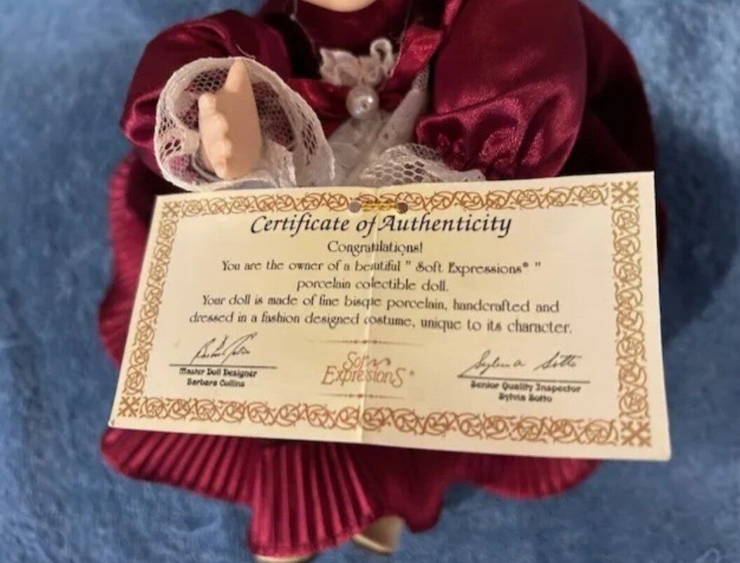 Beautiful Expressions Porcelain Animated & Musical Doll in a burgandy outfit with original certificate included.