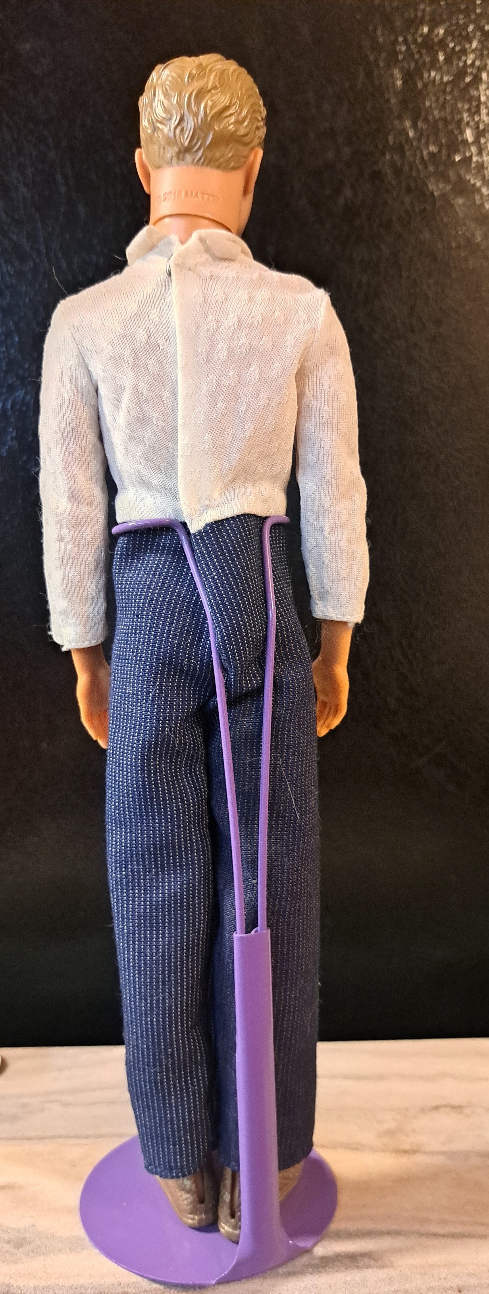 Ken is dressed in a very casual nicely fitting shirt, pants and shoe's.