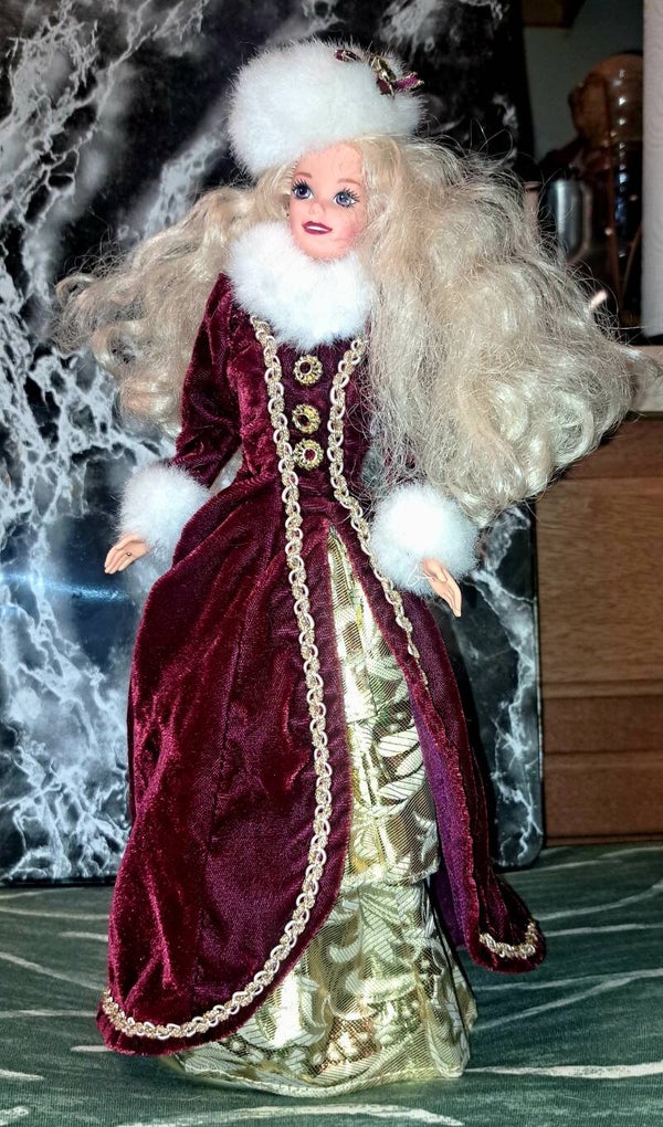 Barbie is styling a beautiful ruby red dress trimmed in white fur with a fur white hat, jewelry and shoes to match.