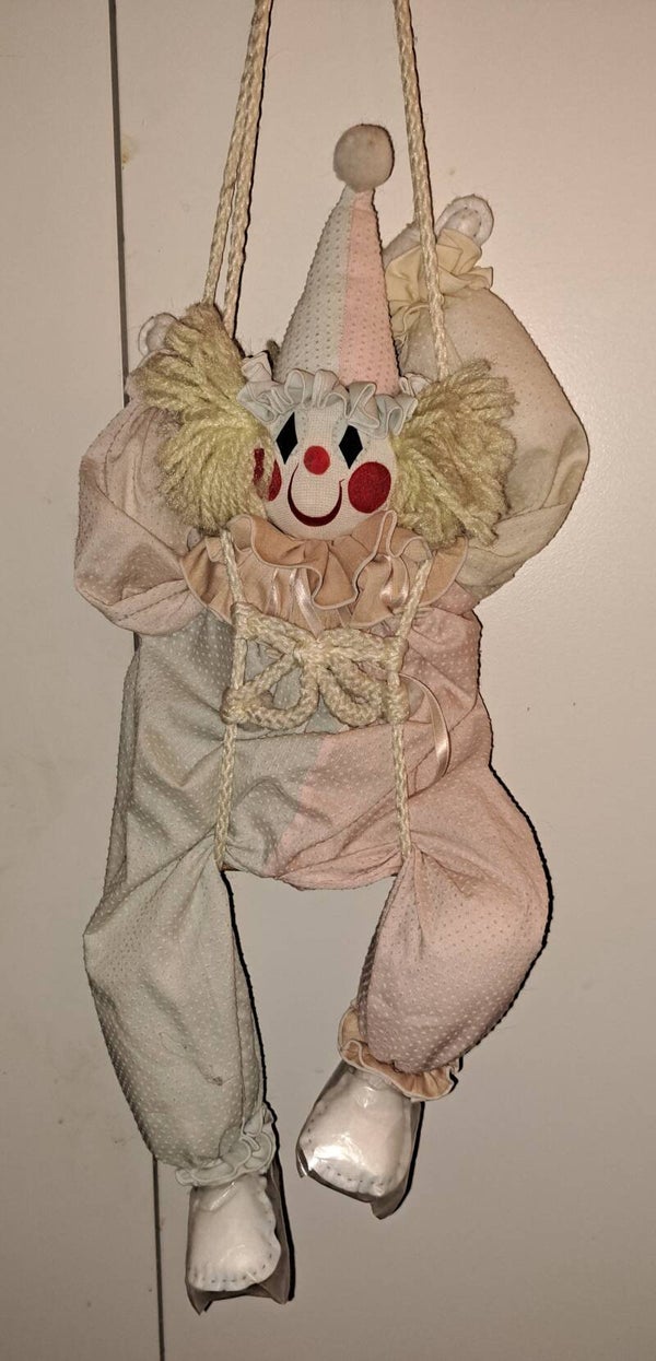 Vintage Hanging Pink & Yellow Windup Musical Clown Sitting On Wood bench