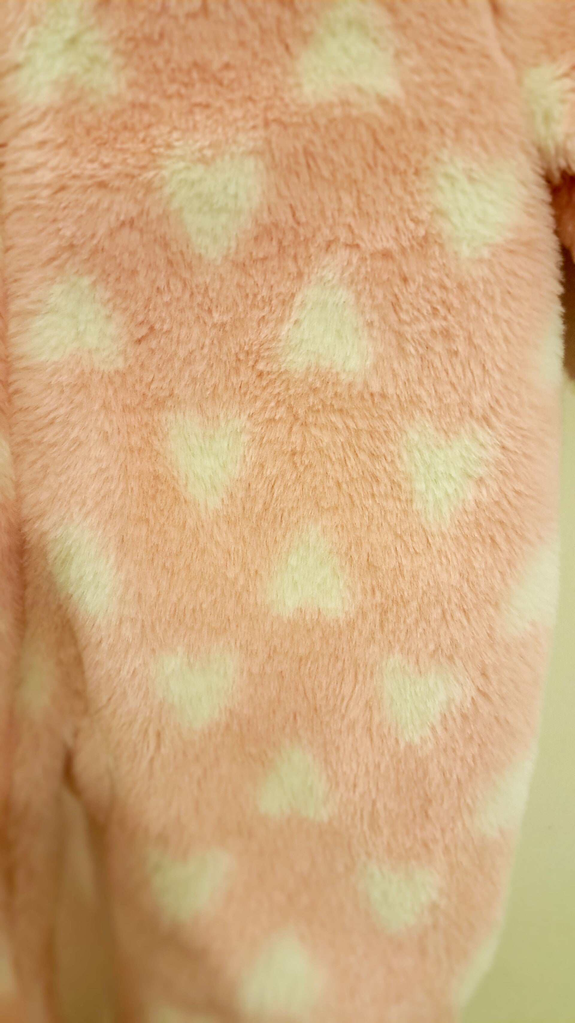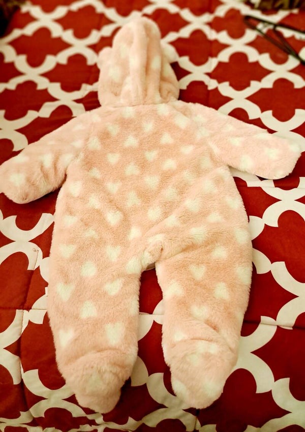 Pink with white hearts Snowsuit 6-9 Months fully covered from head to toe. Pre-Owned in great condition!