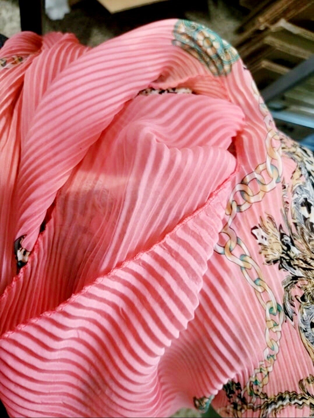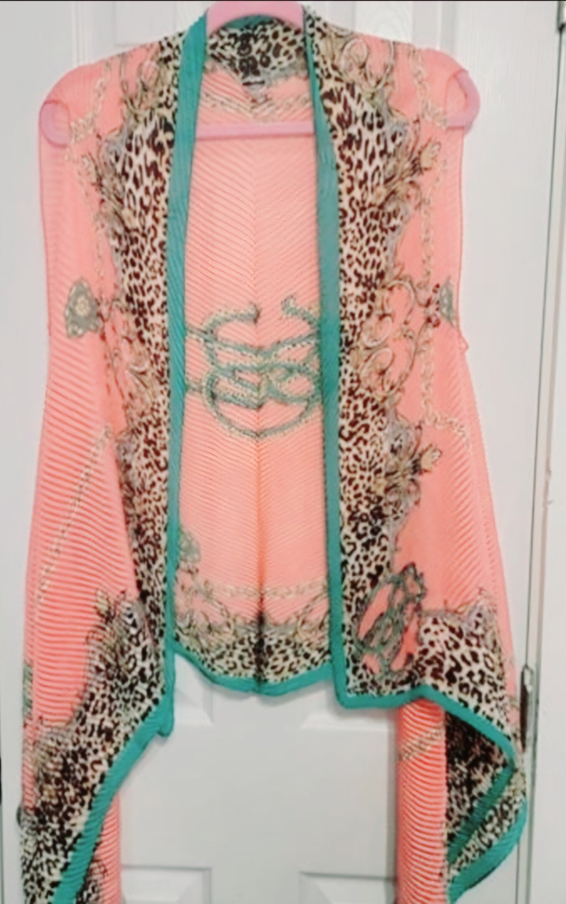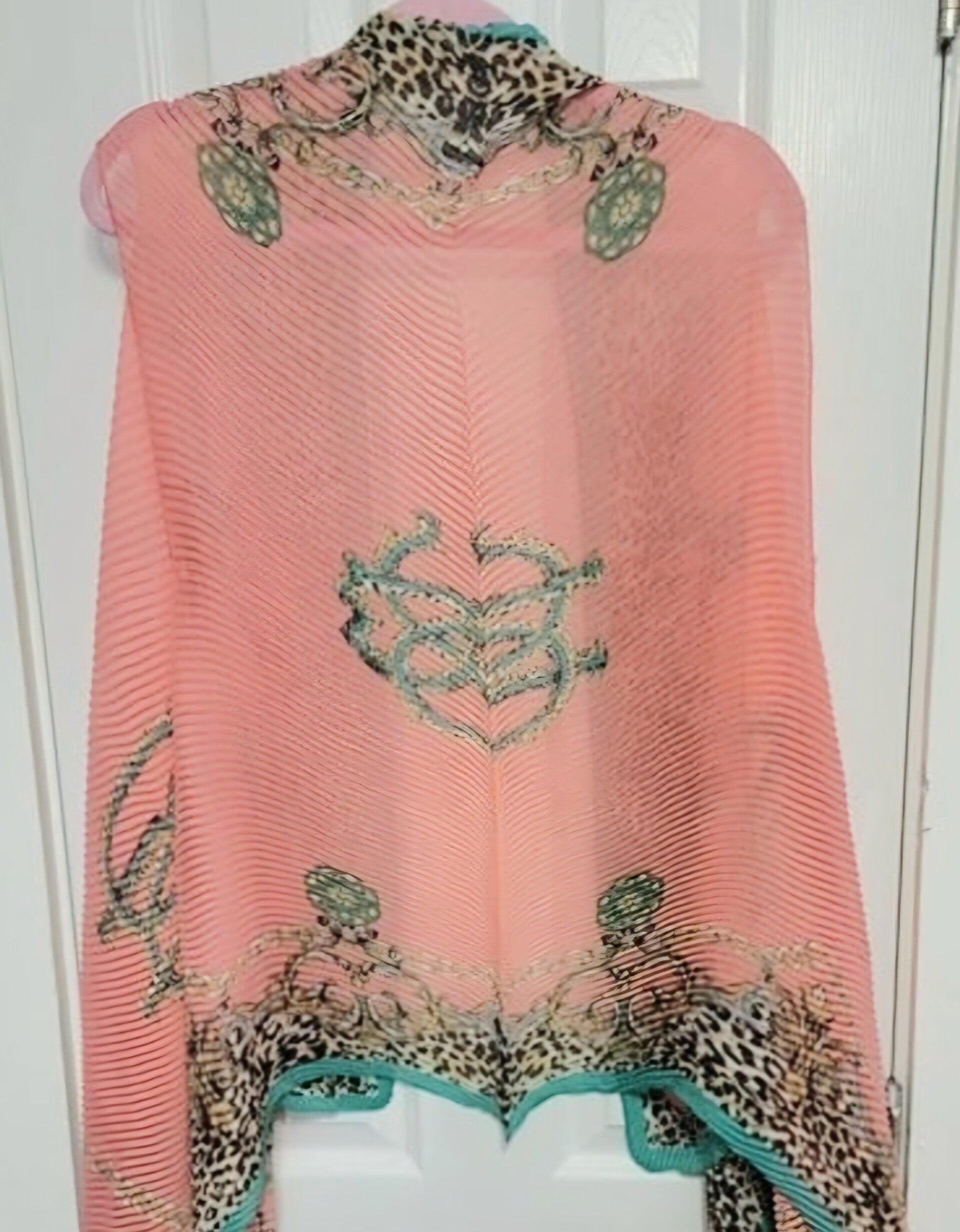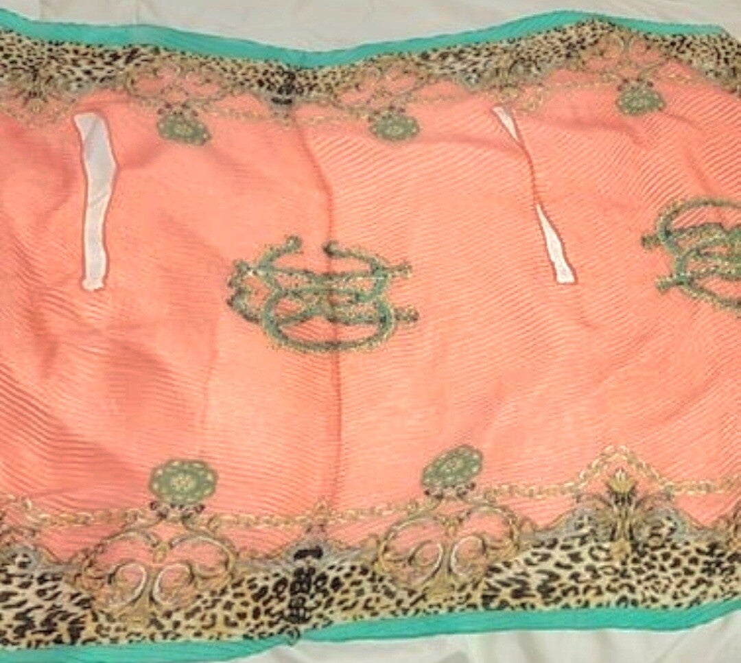 Peach with designs Tunic Shawl long. With no Tag or size, but has been lightly worn and in very good condition.