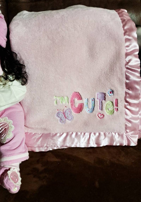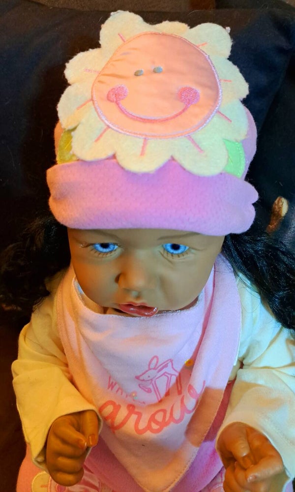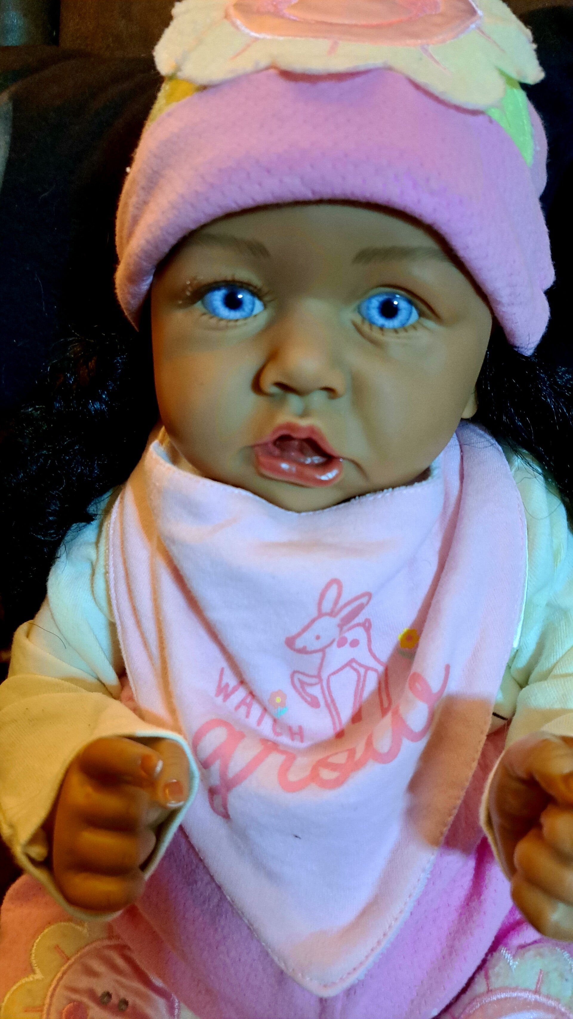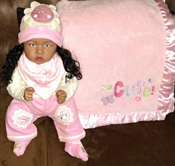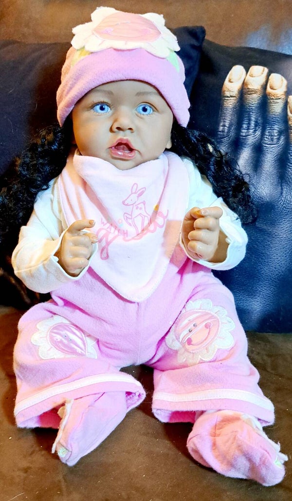 Very beautiful and realistic looking African-American soft vynle little girl doll that has a soft body, blue eyes with lashes, beautiful long black hair, and realistic hands and feet. Doll includes a small pink bunny security blanket, a white Onsie with a cute cat face with pink accents, colorful flower clips in her hair, pink patched pants, hat and socks matching set, a diaper & pink printed bib and a pink knitted sweater including a pink magnetic pacifier and large beautiful satin trimmed and embroidered weighted pink blanket as pictured. Everything is like new and in excellent condition. All of the clothing and blankets are made for a human baby of the same size doll, and the sizes are on the clothing. This doll has been well cleaned and sanitized, as well as the hair being washed and conditioned with little light lotion for styling and keeping in place. There are endless ways her hair can be styled. May or may not come with a soft Squishmallow. (Pictures will be updated soon)